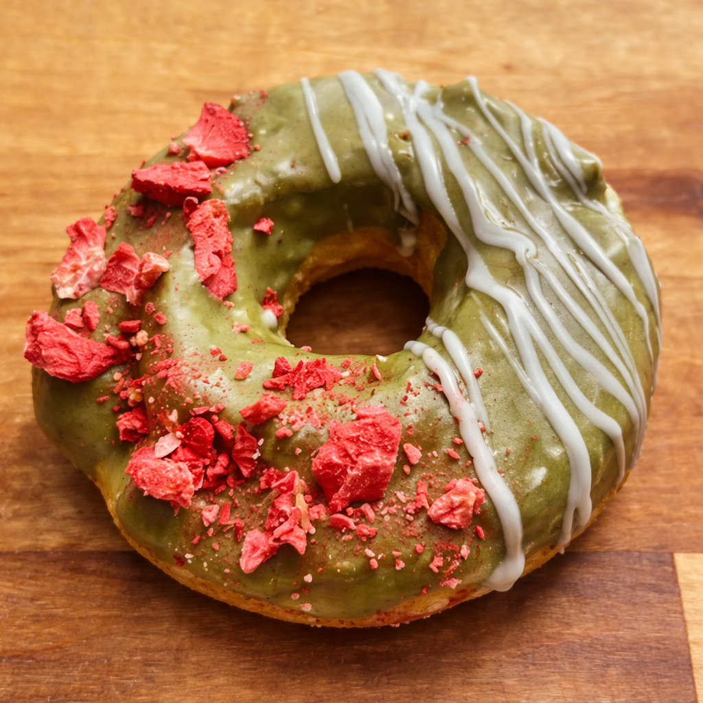 A rich and perfectly textured cake donut topped with smooth matcha icing, sprinkled with sweet strawberry crumbles, and finished with delicate white chocolate drizzles. A delightful balance of earthy, fruity, and creamy flavors in every bite!