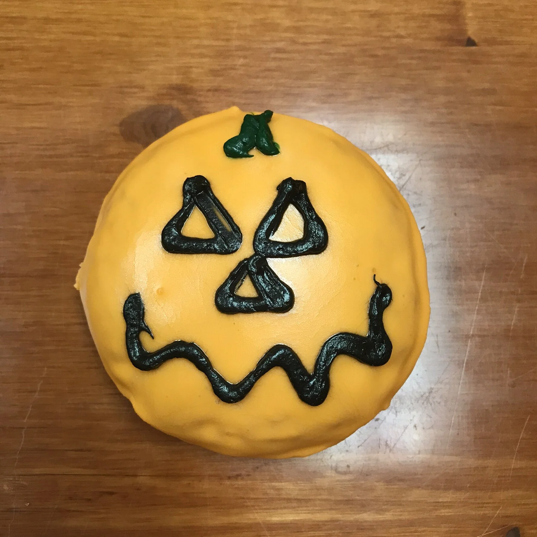 Light, fluffy yeast donut topped with a smooth pumpkin-orange Vanilla Icing and a Spooky Jack-O-Lantern Design!