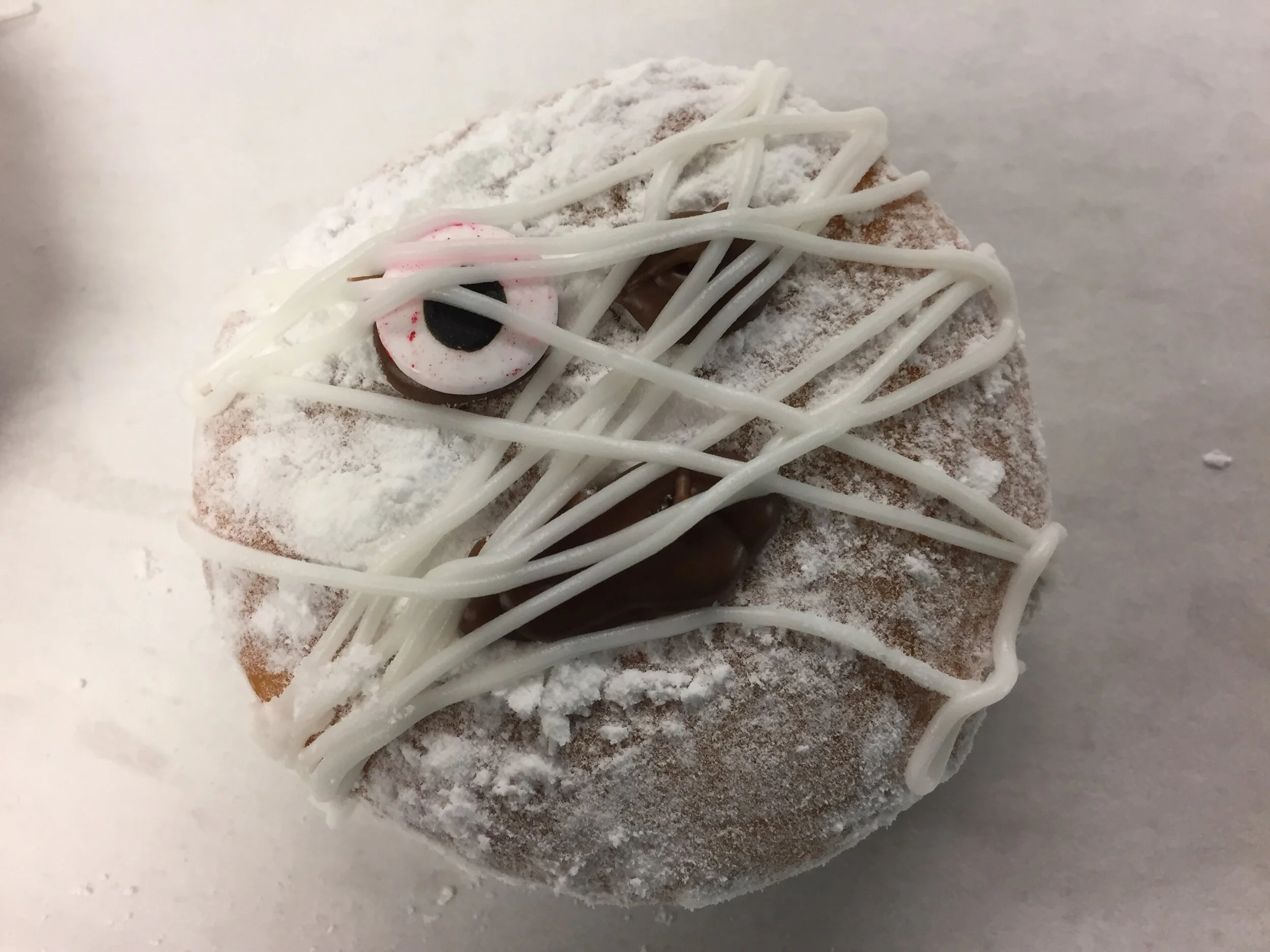 Light, fluffy yeast donut topped with smooth vanilla icing, candy eyes and vanilla cream “bandages”!