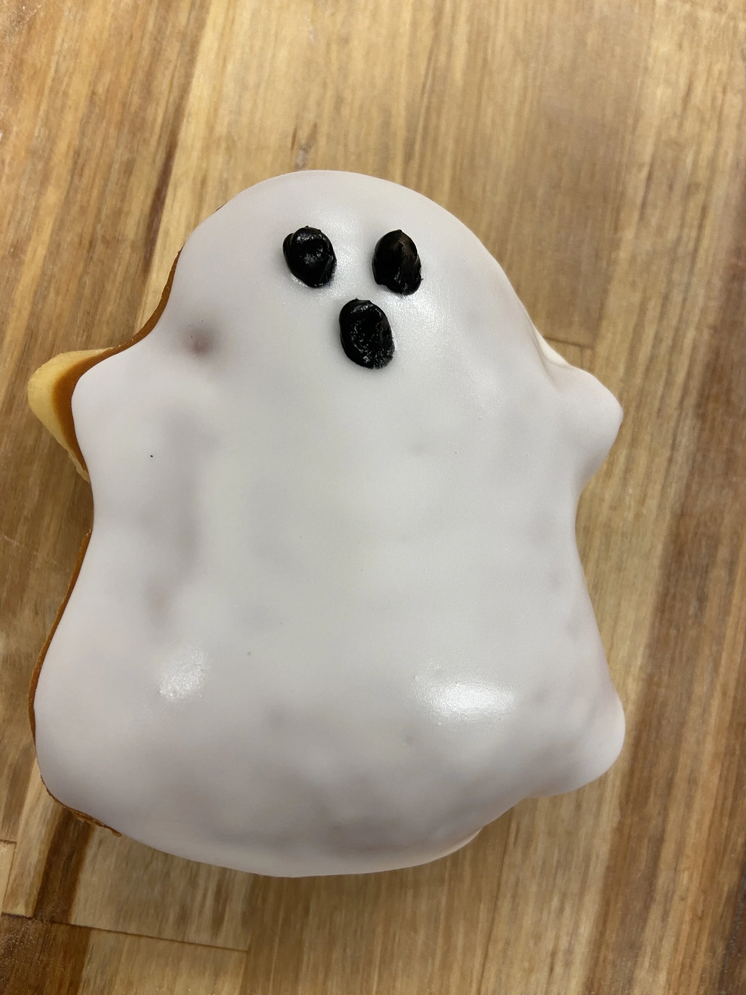 Light, fluffy yeast donut topped with smooth vanilla icing and a ghostly visage!