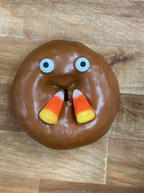 Apple Cider Donut with Spooky Candy Eyes and Candy Corn Fangs!