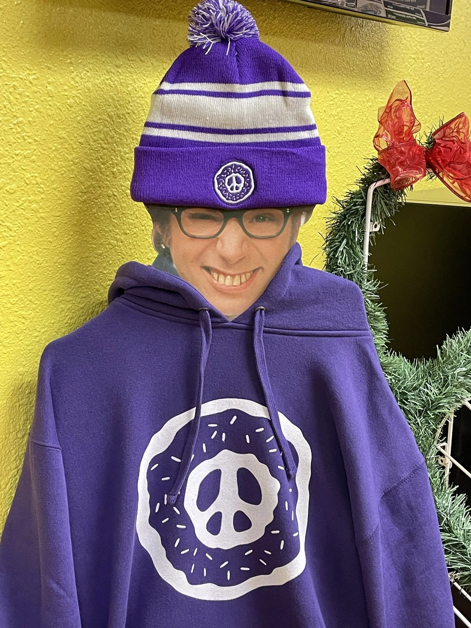 Our purple hoodie is modelled by Austin Powers, but we also have a groovy Tie Dye version, plus 2 different hats: Winter Hat and Purple Cap.